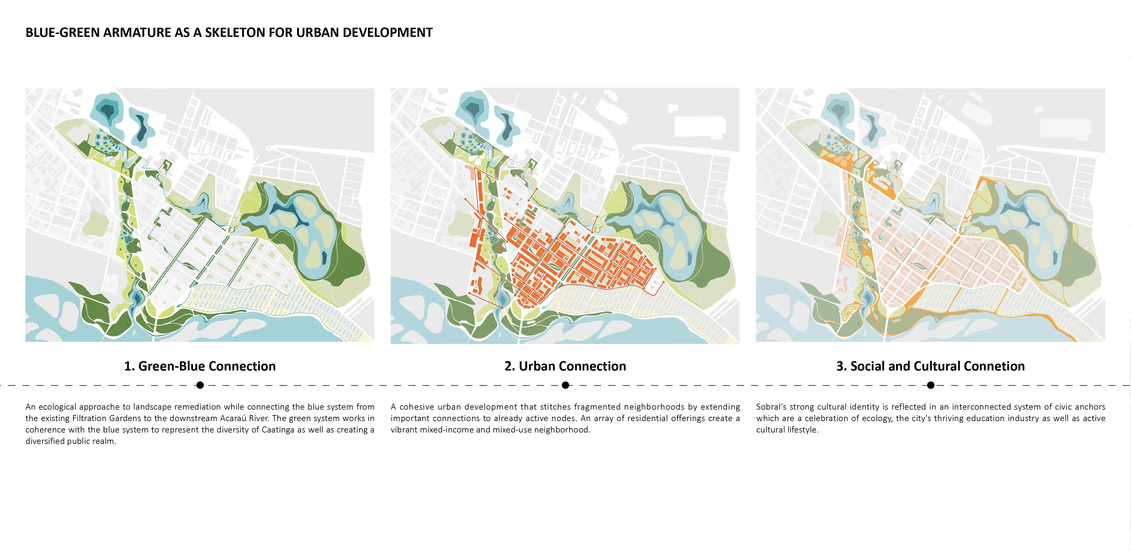 The project exhibits a multi-layered interconnected system- An ecological approach to landscape remediation with a blue-green armature, a cohesive urban development that stitches fragmented neighborhoods as well as Sobral's strong cultural identity reflected in an interconnected system of civic anchors. These interconnected systems are showcased through four major nodes.