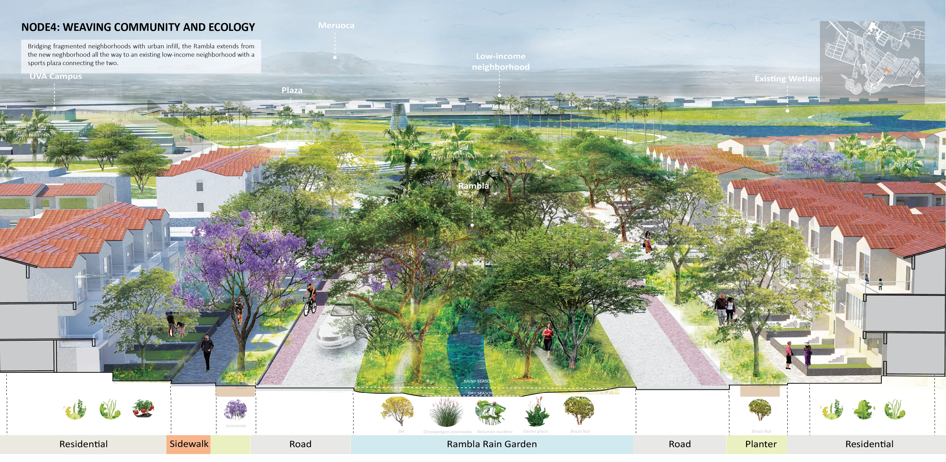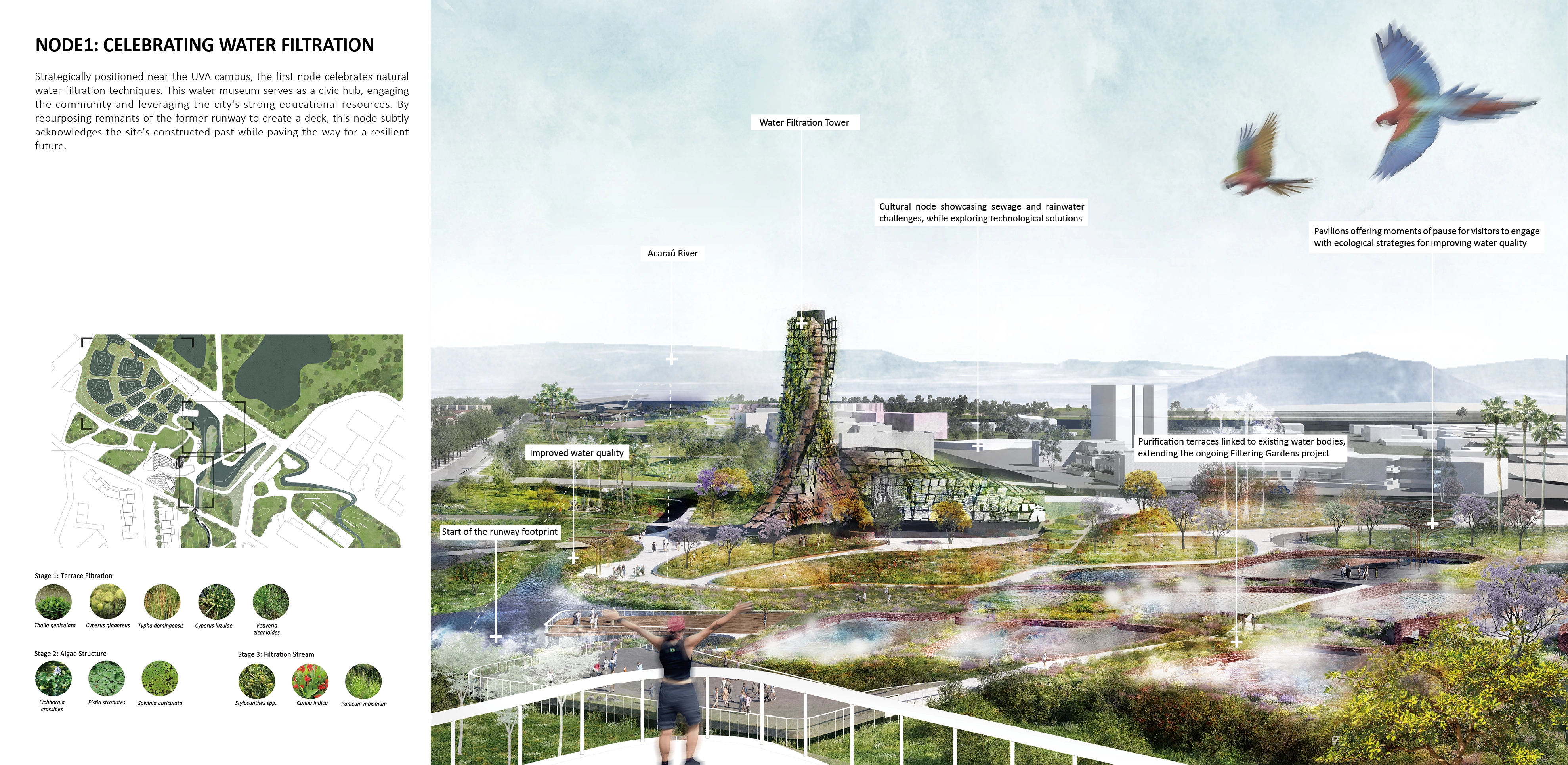 At the heart of our design lies a commitment to water filtration and ecological restoration responding to the city's distraught relationship with sewage water treatment and urban flooding. The project aims to reconnect the blue system—from the existing Filtration Gardens (the city's pilot natural filtration project) to the downstream Acaraú River—while embracing landscape as a pedagogical tool for environmental awareness and community engagement. Water management strategies showcase the region's diverse habitats, integrating ecological approaches to landscape remediation.