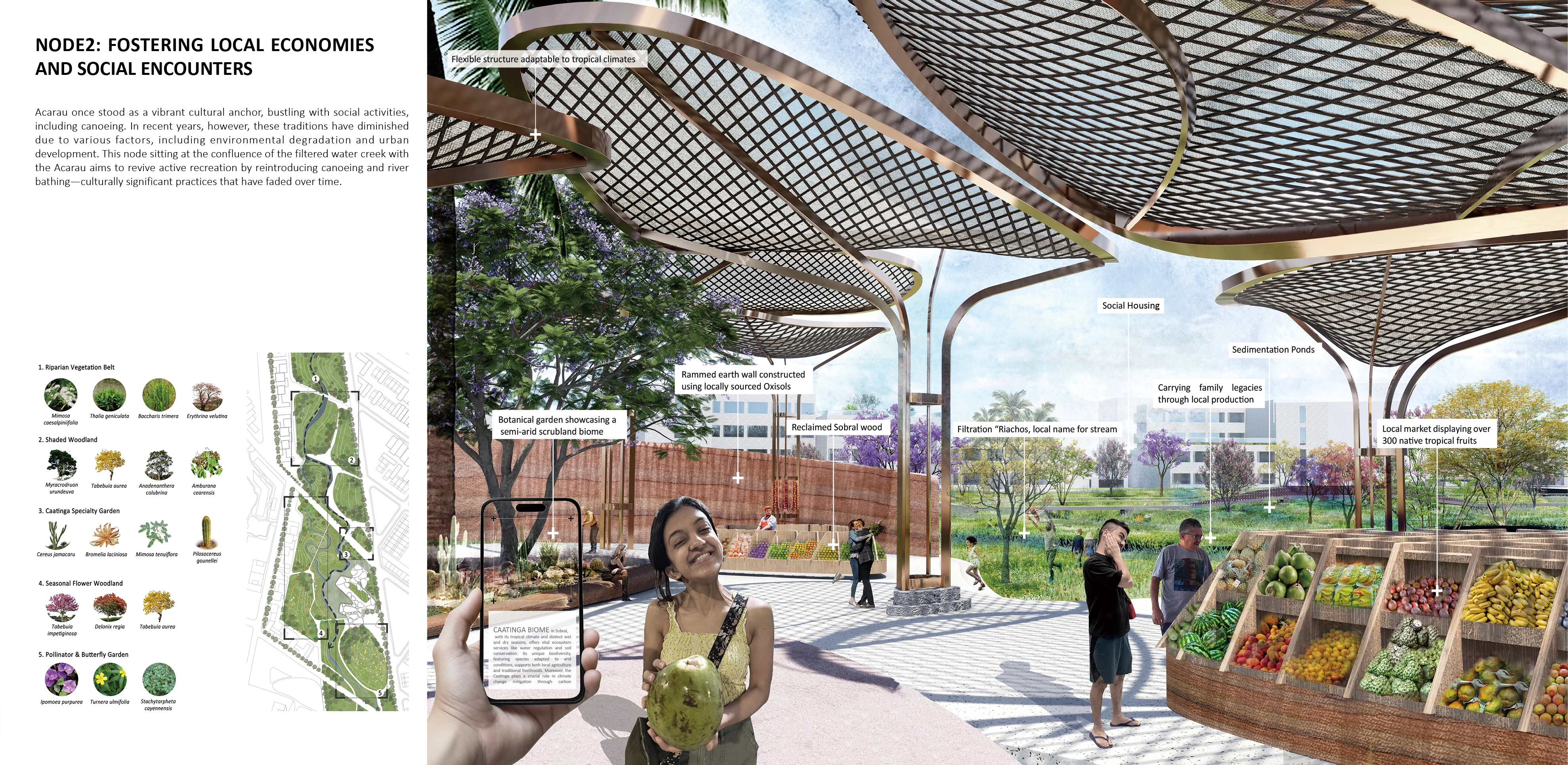 Acaraú once stood as a vibrant cultural anchor, bustling with social activities, including canoeing. In recent years, however, these traditions have diminished due to various factors, including environmental degradation and urban development. This node, situated at the confluence of the filtered water creek and the Acaraú River, aims to revive active recreation by reintroducing canoeing and river bathing; culturally significant practices that have faded over time.