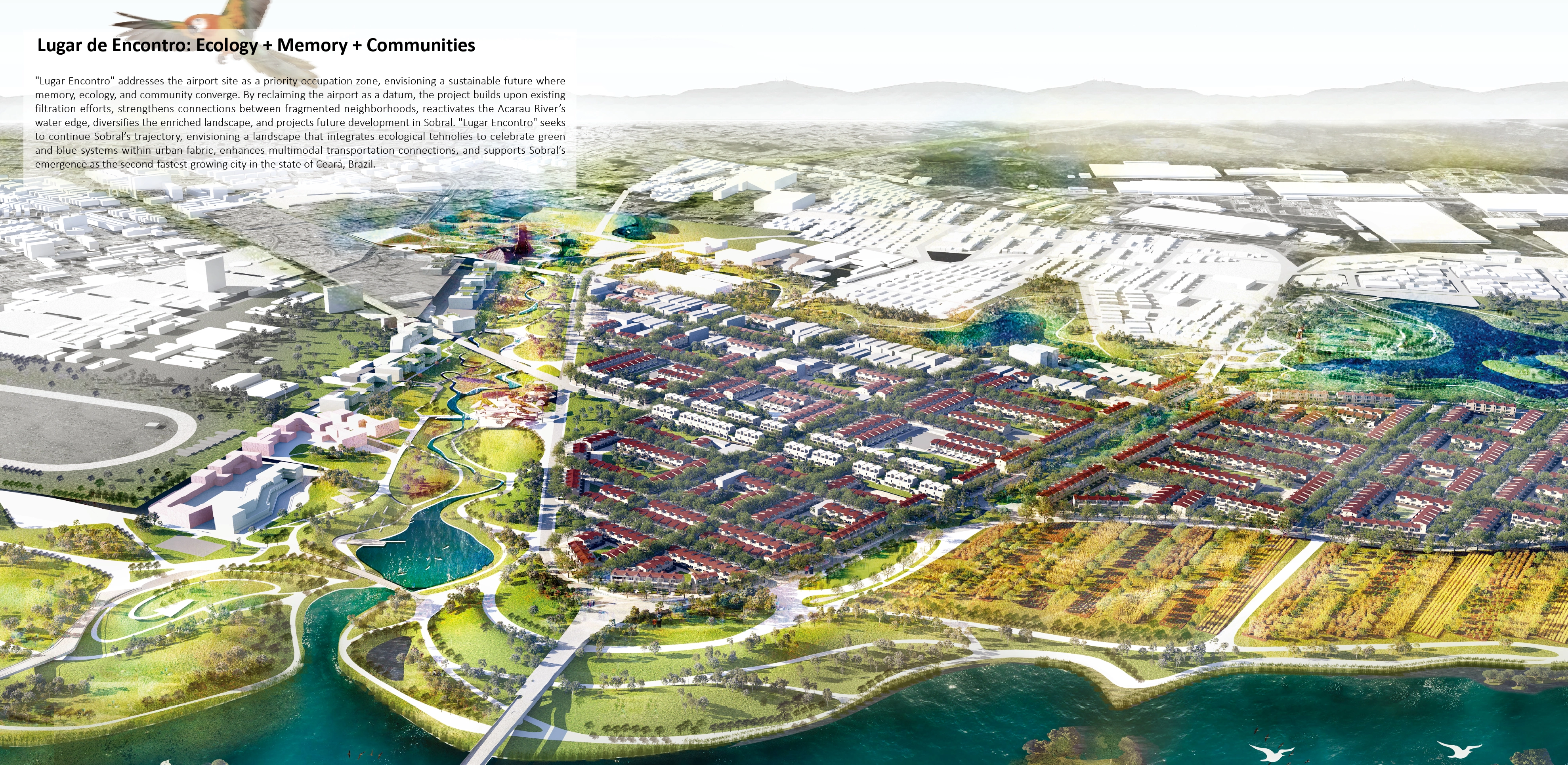 "Lugar de Encontro" or a Landscape of Encounters is a transformative landscape urbanism project in Sobral, Ceará that repurposes a former airport site (closed in 2017) that displaced the historic Pajeú Creek disrupting the Jaguaribe watershed. At the heart of our design lies a commitment to water filtration responding to the city's distraught relationship with sewage water treatment and urban flooding. By reclaiming the airport as an ecological armature, the project builds upon existing filtration efforts, strengthens connections between fragmented neighborhoods, and creates a diversified public realm representing the rich biodiversity of the underappreciated Caatinga biome.