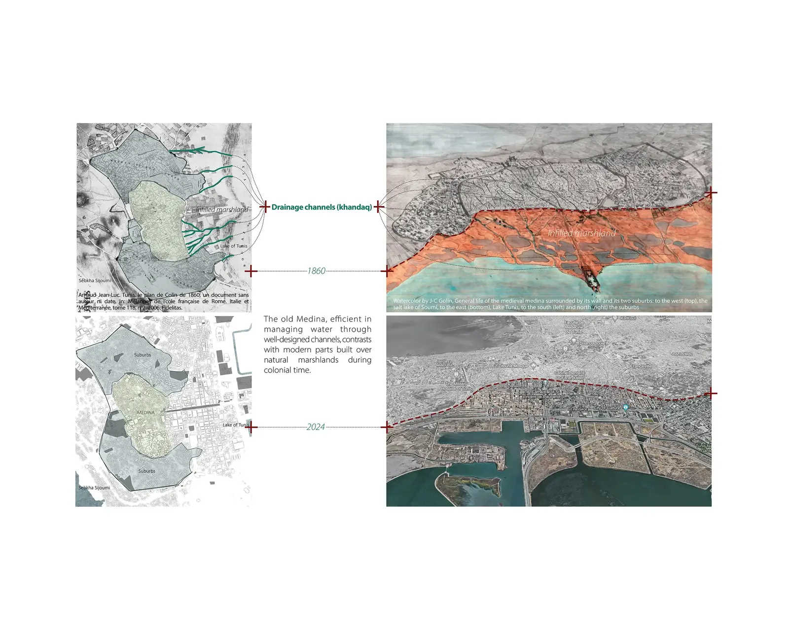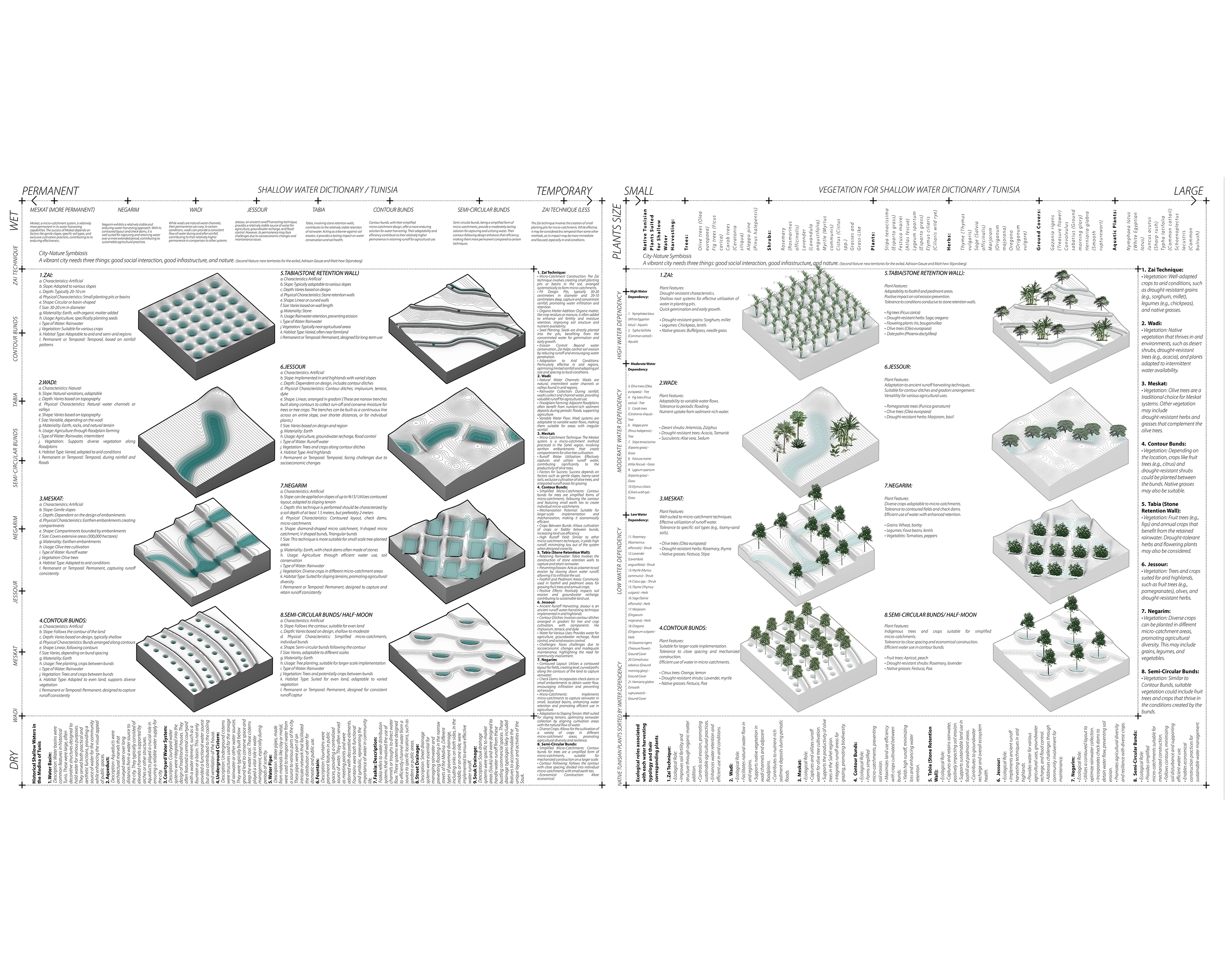 This thesis proposes adapting traditional water management practices for the colonial city of Tunis to reduce flash flood impacts by 9%, while nurturing spaces for flood control, temperature regulation, and social interaction. Colonial and post-colonial development ignored water systems, and climate change has worsened the situation.The study developed a “shallow water dictionary” and documented multi-scalar traditional water management practices as a manual for future landscape architectural in Tunis.This project proposes an updated version of the traditional North African water management systems to address critical urban issues in Tunis: sea level rise and flash floods, rising temperatures, social vulnerability, and habitat preservation.