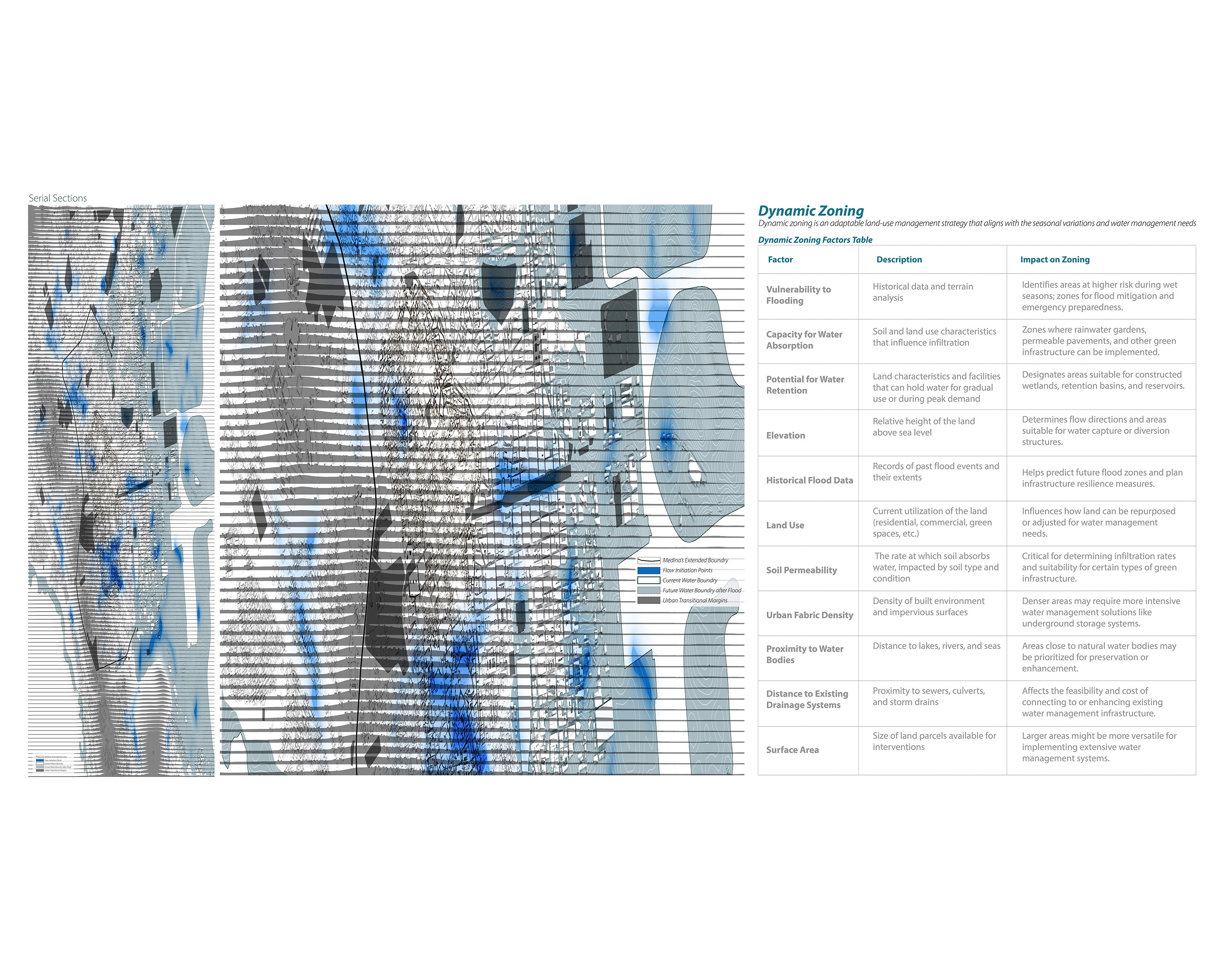 Dynamic zoning strategies adapt urban spaces to climatic conditions, converting flood-prone areas into water sponges during rainy seasons and recreational parks during dry periods. This enhances the city's resilience against future climate uncertainties. Along with Dynamic Zoning, the project proposes establishing the "Tunis Water Management Trust" to maintain and manage water systems, involving local communities to ensure sustainability and continuing engagement.