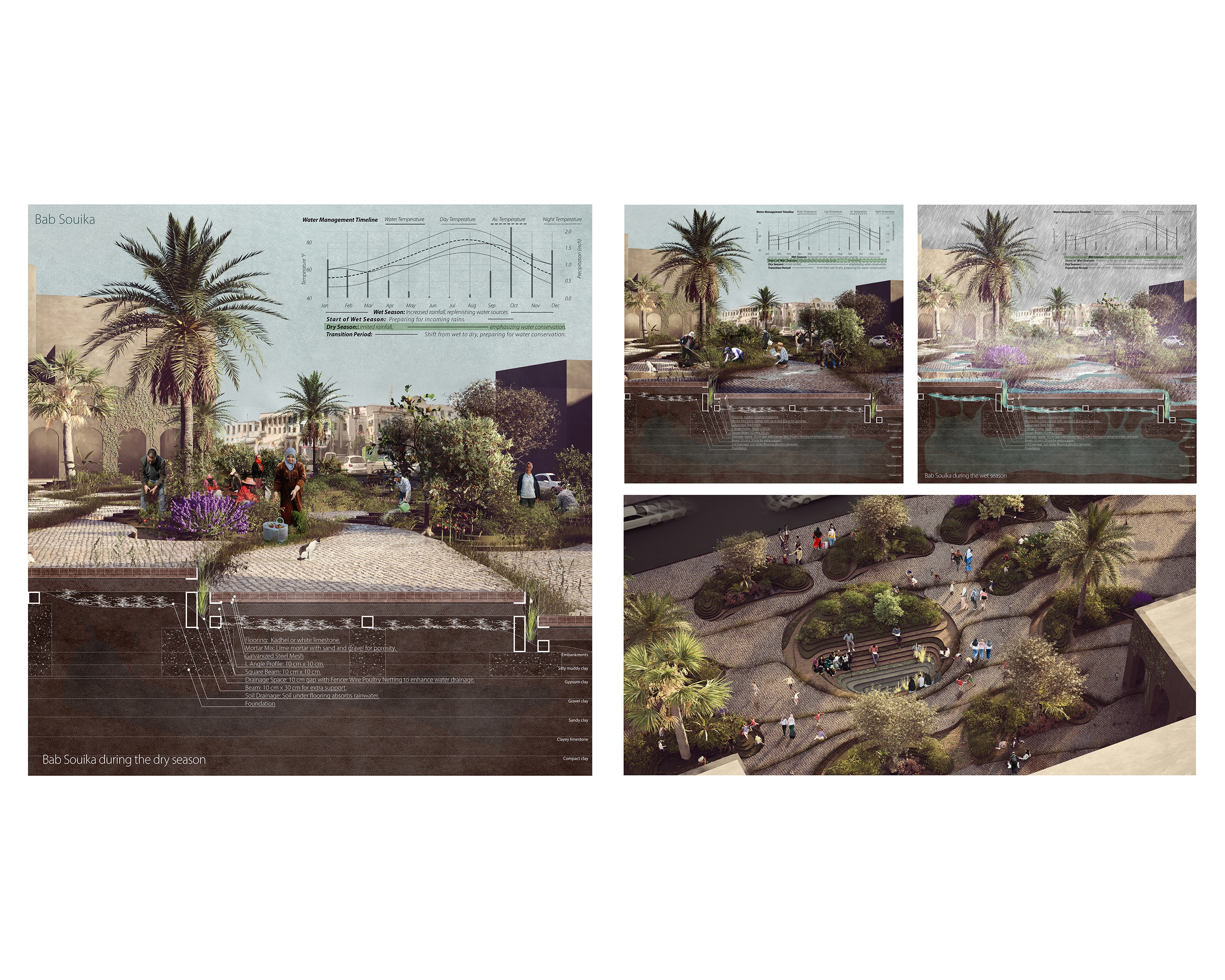 All 84 sites require a water management timeline with wet and dry seasons and two transitional periods. Al Habib Thamer Park (XL size) uses the Jessour and Tabia traditional systems based on their size and slope. Jessour involves building stone dams to slow water movement and prevent erosion, and acts as a sponge during the wet season, absorbing rainwater to prevent flooding and storing it in the soil. Tabia, which features terraced fields for water retention and soil fertility, was adapted for steeper areas of the park. In the dry season, the park becomes productive, providing food and economic benefits while maintaining a cool oasis for recreation. Medium-sized sites, such as the Bab Souika, were designed with the half-moon typology, while small sites, like Bab Bnet, utilized the Zai system.