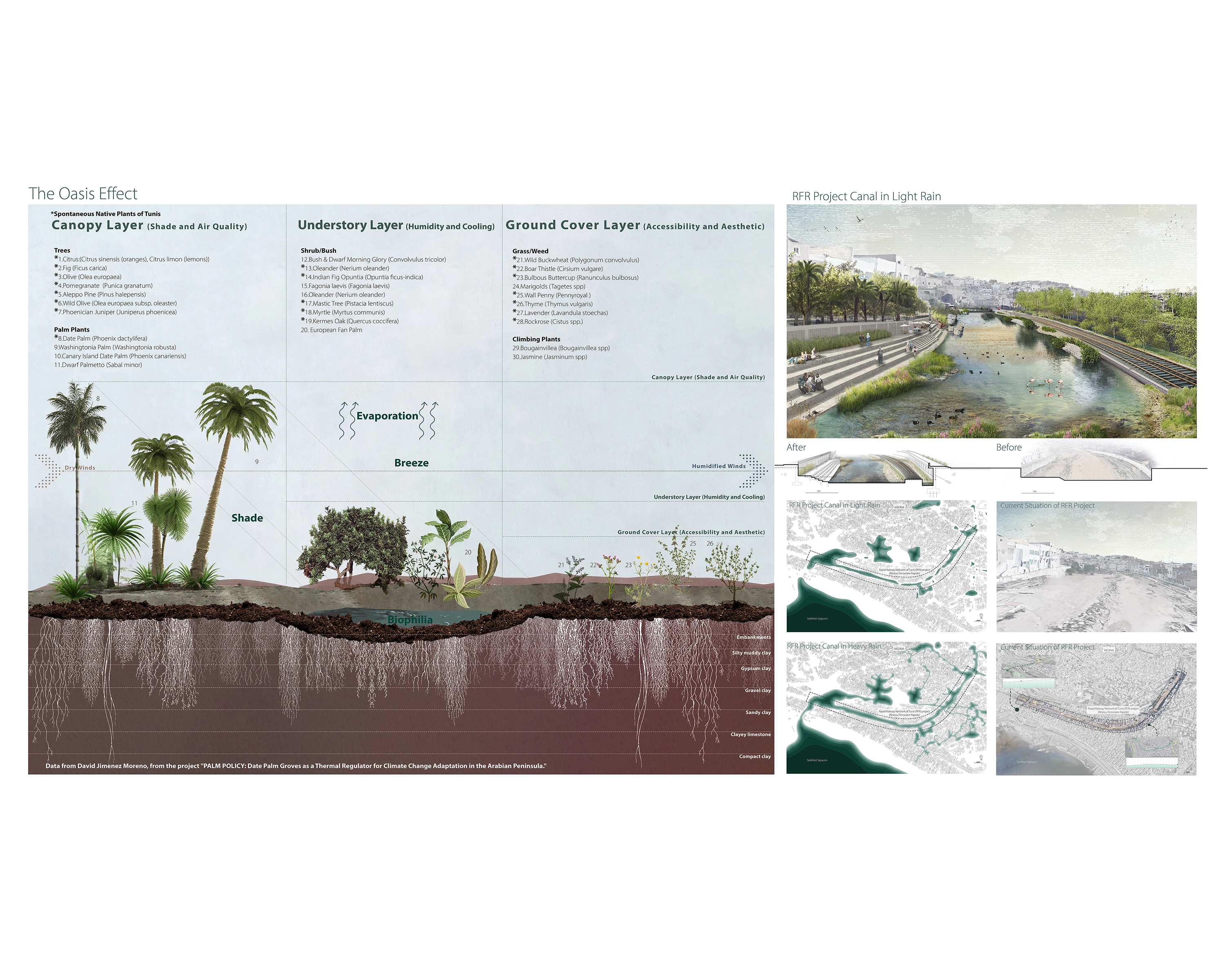 "The Oasis Effect" serves as a model for transforming urban areas, especially in arid regions, by restoring and adapting traditional water management systems to create a resilient urban environment while respecting historical roots. Interventions in 84 selected sites are expected to mitigate about 9% of inland floods, with the project envisioned to extend beyond these sites, creating a cohesive water management system reminiscent of Medina's historical network.