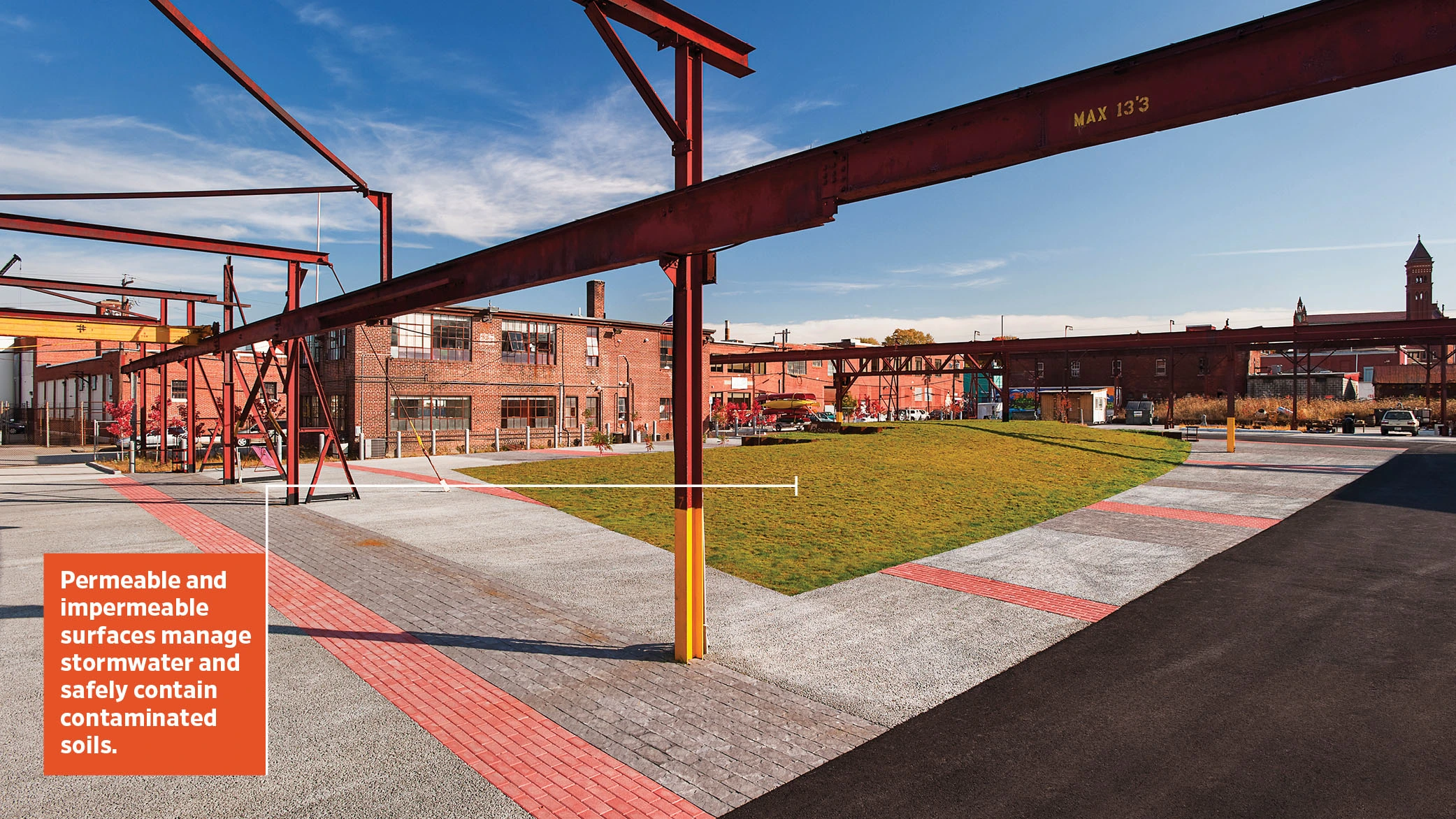 To sustainably manage stormwater while also ensuring that contaminated soil did not leach into the neighborhood, Klopfer Martin Design Group needed to build a series of “moats” that direct infiltration and control the volume of stormwater being held. These moats are found at the edge of the paved “carpet.” They are filled with water-loving plants that filter stormwater and prevent erosion.