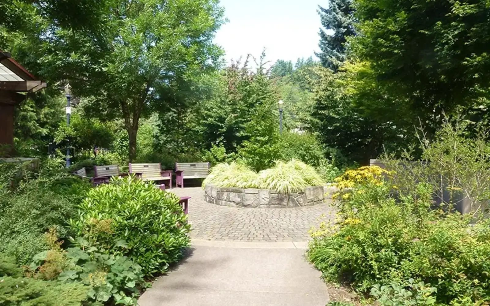 The Portland Memory Garden, designed by Oregon ASLA as a pro-bono project led by Mark Epstein, Richard Zita, and Brian Bainnson, ASLA, is located within Ed Benedict Park in Portland, Oregon, and created for people with Alzheimer’s to exercise through safe walking. The circular walking path, with a single entry point, eliminates wayfinding concerns, focusing visitors on the act of walking. A fence encloses the garden, creating a single entry and exit point to reduce the risk of wandering. Benches along the path provide plenty of opportunities to rest, for both those with Alzheimer’s and their caretakers. Tree cover and lush planting make the garden a serene environment. Bathrooms are located with a clear line of vision so visitors can quickly reach them if the need arises.