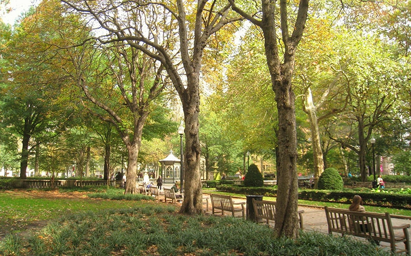 Rittenhouse Square, in Philadelphia, Pennsylvania, features benches with arms along all of its pathways, providing accessible places to sit throughout the square and space for wheelchair users to stop next to the benches. The pathways are wide enough for multiple groups to pass one another. Different materials indicate where to walk and where to rest. The scale of the park creates open areas for gathering and smaller intimate areas where two people can communicate (see below).