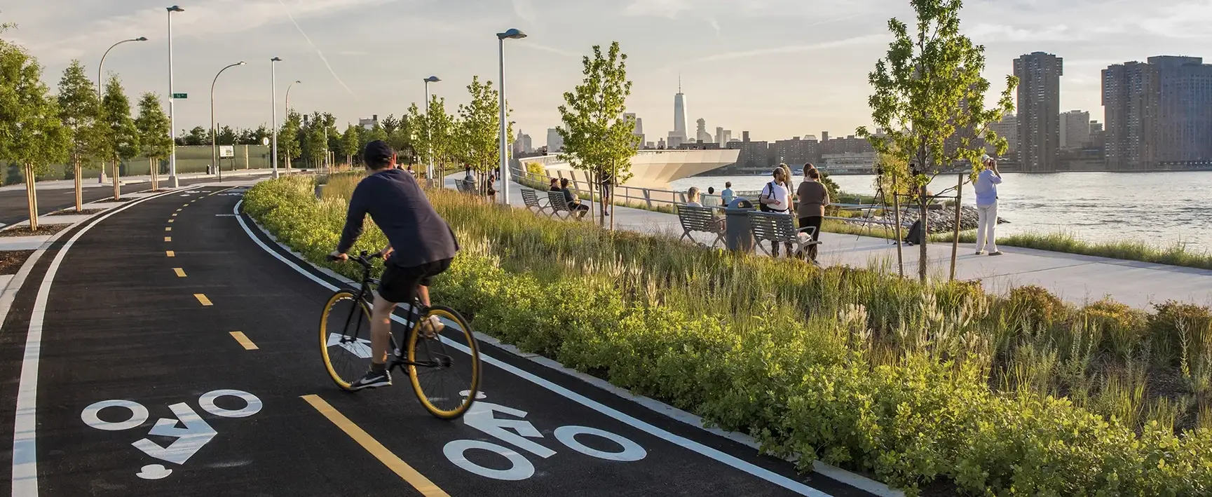 Resilient: Extreme weather events can easily shut down transportation networks. Multi-modal transportation systems are resilient to the uncertainties posed by climate change, such as rising temperatures, more frequent and intense storms, and sea level rise. Landscape architects design systems with multiple, interconnected transportation options that create redundancy and flexibility, qualities that help communities evacuate and rebuild quickly in the face of natural disasters.