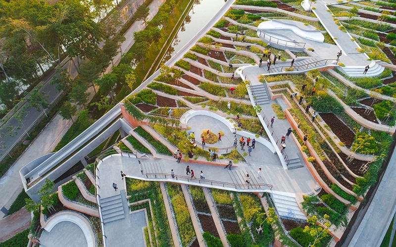 The Thammasat University in Bhutantanang, which is in the greater Bangkok area, will become the biggest urban farming green roof in Asia at 7,000 square meters (75,000 square feet). The roof mimics the structure of rice terraces and how farmers use topography to absorb rain, slow down runoff, and grow food.