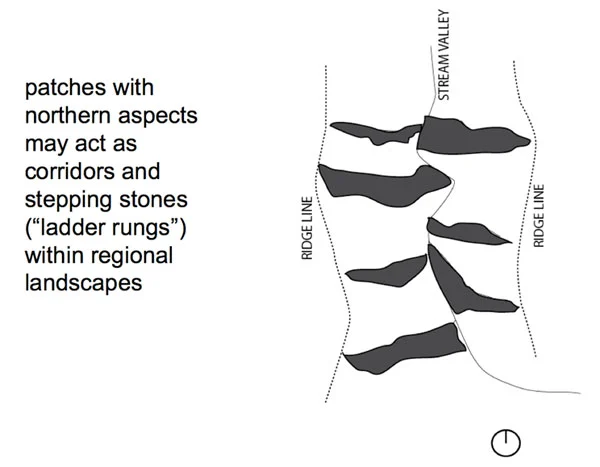 In addition to making sure the conserved patches are shored up with buffers and a region has reduced its “matrix hostility,” climate change creates an imperative to add corridors and stepping stones – both north-south (connecting across latitudes) and up-down (connecting across elevation gradients) – at all spatial scales. As the ecologist Stuart Pimm has pointed out in a recent article, it’s more efficient for species to move a few thousand feet laterally to move up by hundreds of feet of elevation as a way of staying cooler than it is to move tens or hundreds of miles north to get the same benefit. But going up in elevation is like walking the plank, because it means there is less area available as the species go up – and the solution is limited by the maximum height of the hills or mountains available.