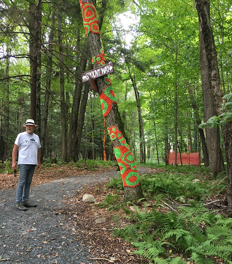 There was a guy in one of the trailers who was drawing plans. He drew one plan of the Bindy Woods with the trails, so we used that to figure out that interesting area. Hippies had set up 20 something booths to sell tie dye, Indian prints, roach clips, or whatever. They put up hand-painted signs on the trees naming the paths -- highway groovy path, etc.