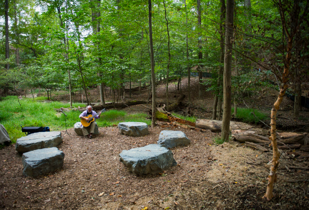 The Green Road was designed with the help of Jack Sullivan, FASLA, to provide a place for veterans to heal from PTSD and traumatic brain injuries. Featuring a forested area with paved, accessible trails, the space intentionally retained “wild” and natural elements to mirror the wild and chaotic realities of war that these veterans have lived through.