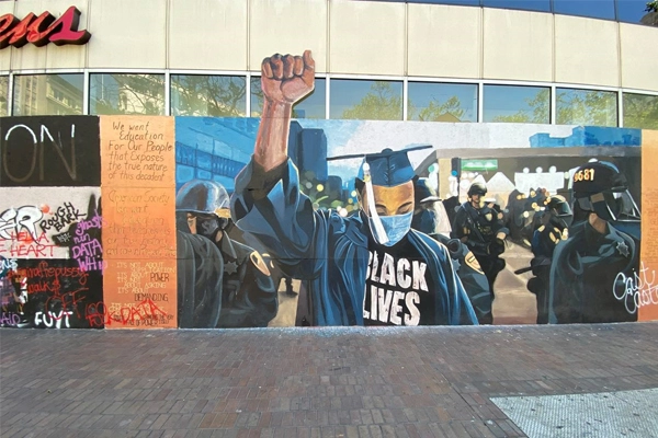 City Hall Park (Oscar Grant Plaza), HALS CA-157 Oakland, California By Cecilia Distefano, Kelly Flairty, Cathy Garrett, ASLA (CA PLA, NVLA, LEED AP, CLARB), Evan MacGregor, Petra Marar, ASLA, Adrienne Newton, ASLA (CA PLA), Grace Tada, Assoc. ASLA, and Kari Tanaka (CA PLA, ULI) Oscar Grant Plaza—unofficially eponymously named in honor of the Black East Bay resident killed by San Francisco Bay Area Rapid Transit (BART) police in 2009—served as a central destination for protests, civil disobedience, vigils, art, and other public actions of the summer 2020 Black Lives Matter uprising for racial justice.