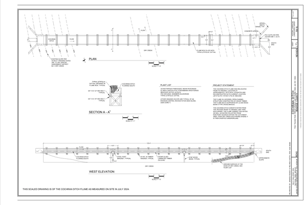 The Cochran Ditch, one of Reno’s first irrigation ditches, represents the establishment of water systems crucial for meeting the growing agricultural needs of the burgeoning city during the nineteenth century. The HALS documentation summarizes the history of the resource and identifies key features along the length of the site, including measured drawings of the Cochran Flume, one of the landscape’s primary built elements.