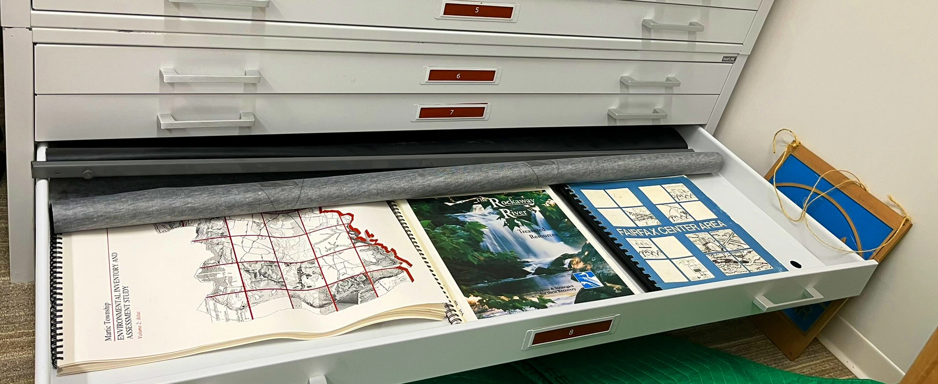 - Are there file cabinets, flat files for large drawings D-sized sheets and above ?
